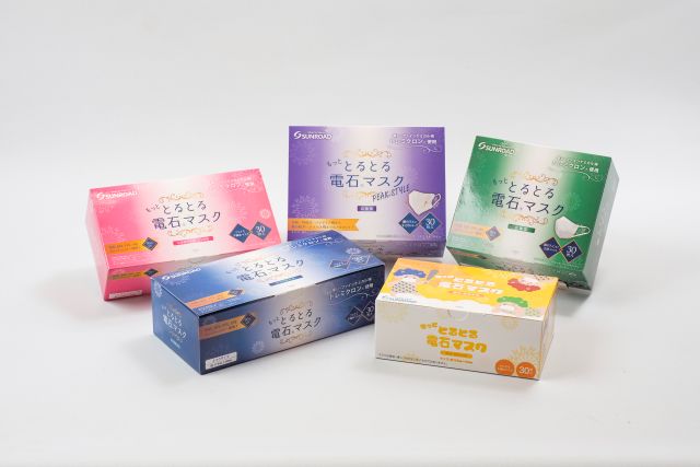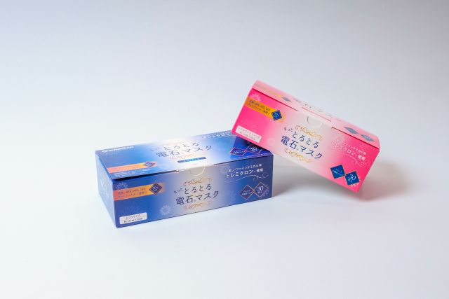 「もっと とるとる電石マスク」では、通気性の高いフィルターと耳に優しいワイド平ゴムを採用。