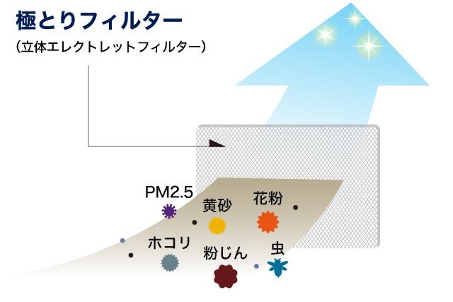 極(ごく)とりフィルターは、ホコリや花粉をしっかりキャッチしながら、空気をスムーズに通す設計。