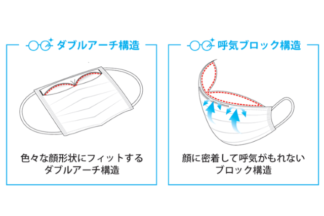 特許取得『ダブルアーチ構造と呼気ブロック構造』で、目に息が当たらないように工夫されているので、