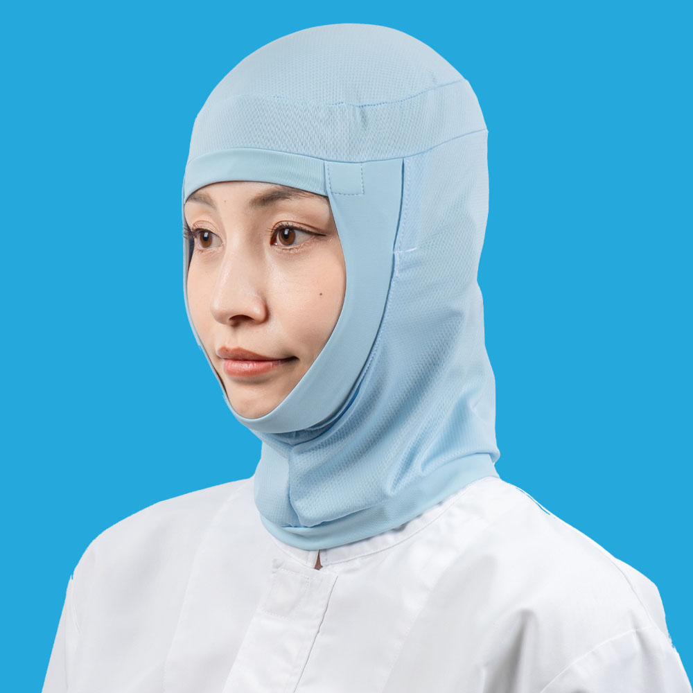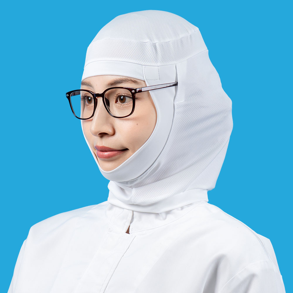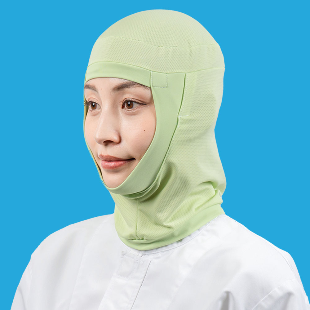 顔と肌との密閉性を高め、露出を防ぎ、毛髪のはみ出しを防ぐフルフェイスタイプ型インナーキャップ。帽子全体は、伸縮性、通気性のある素材を使用し、短髪、長髪の方もピッタリフィット。頭周りのフィット性が良く、肌触りも感触の良い、吸汗速乾消臭生地を使用。